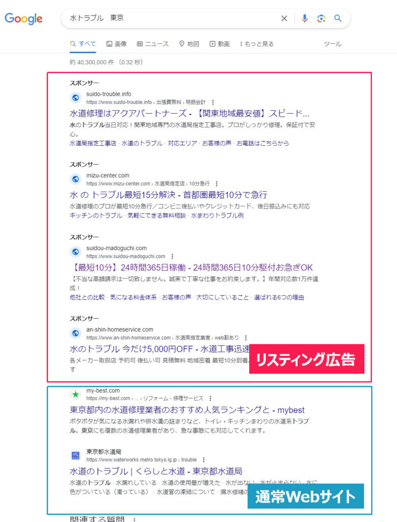 例えば、「水トラブル 東京」と検索した際、以下のようなページが表示されます。