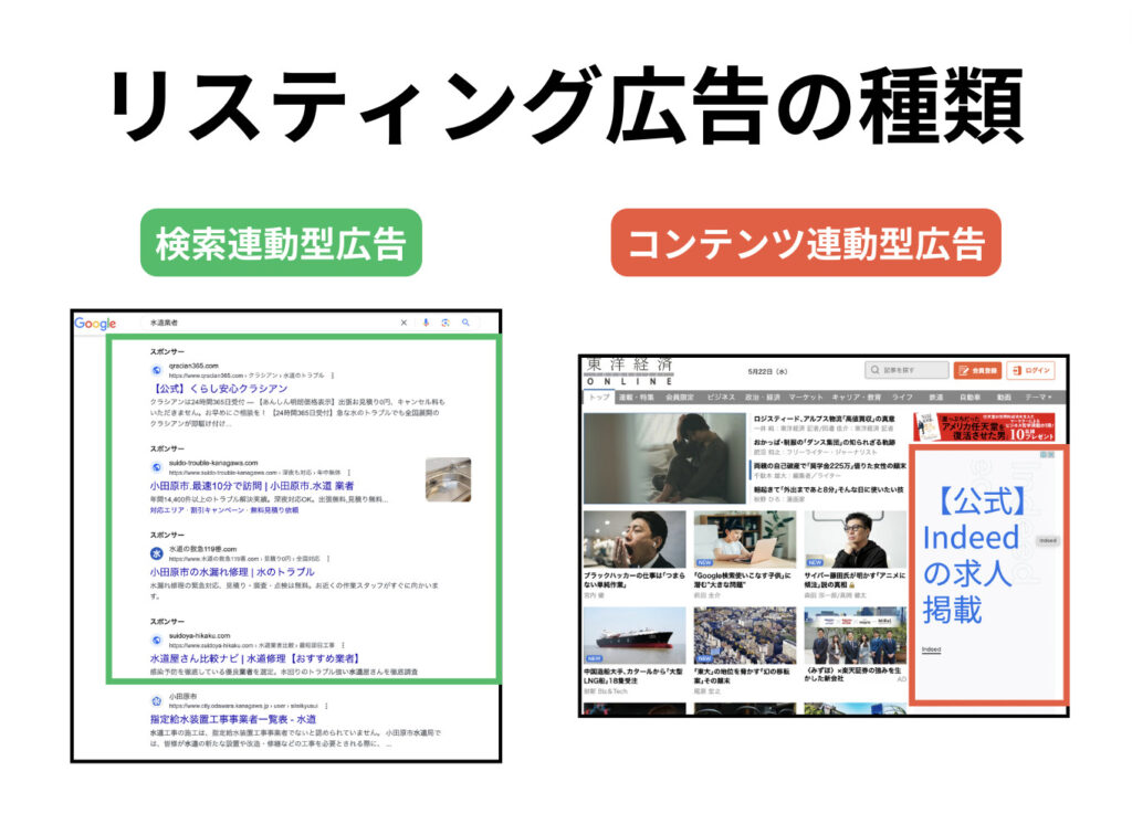 リスティング広告には、主に2つの種類があります。検索結果の上部や下部に「広告」と表示されるものが検索連動型広告です。一方、コンテンツ連動型広告は、Webサイト内にあるバナー広告のことです。
