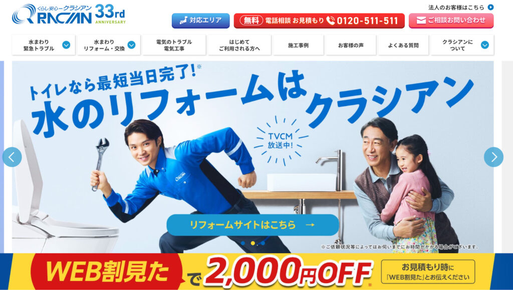 ホームページでは、緊急対応の迅速さを強調しており、「今すぐ対応してもらえる」という安心感を与える作りになっています。これにより、訪問者が緊急事態において安心して問い合わせができます。また、「WEB割引を見た」というキャンペーンも実施しており、青を基調としたデザインの中に、黄色と赤で強調することで、CVR(コンバージョン率)を高める狙いがあるように伺えます。