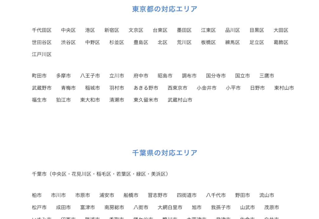 特に東京都と千葉県の各地域名称をフッターに記載することで、ローカルSEO対策を施していることが伺えます。