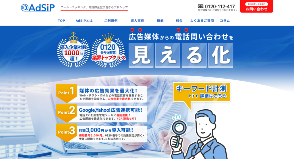フリービット株式会社の「AdSiP」“この電話、どの媒体を見てかけてきたの?”を見える化するコールトラッキング(電話効果測定)サービスです。